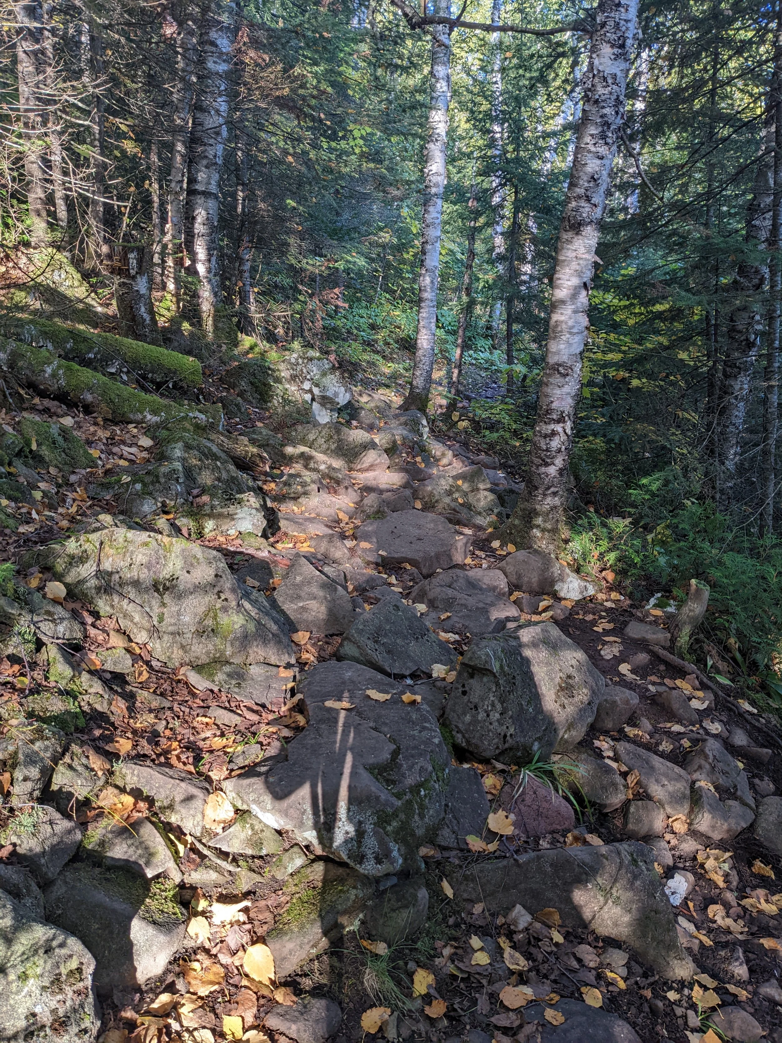 The day started by hiking through Cascade River State Park, which is one of my favorites along the north shore. Approaching Lookout Mountain from the south was much easier than climbing all the switchbacks from the park side! Due to a bridge closure on Cook County Road 45, I took the east side of the Cascade River loop (technically a spur trail, but it was the recommended reroute from the SHTA.) Along the east side of the river, there were some trail structures that were aging, some missing ties on downhill slopes, and especially near the northern end of the spur, a lot of mud. I was rewarded with some awesome views of the Cascade River, and the “hidden falls” near the road crossing. Just north of Cook 45, I came across some wise words written in the North Cascade River campsite trail register from “Texas” and “Mudflap”: “When in doubt, the trail goes up.”